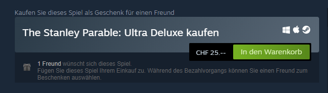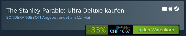 Ist jetzt bei Steam im Angebot und mit CHF 16.67 günstiger als der Deal. Ich seh das Angebot allerdings nur, wenn ich eingelogged bin. Gilt allenfalls nur, wenn man die Ur-Version von Stanley Parable hat.