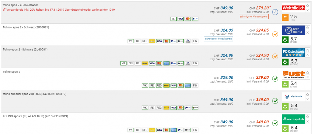 Bei Weltbild gibt es das tolino epos 2 eBook-Reader für den Bestpreis von CHF 279.20. Diesen Preis gibt es schon seit einige Tage und man erhält ihn mit dem Gutschein Code weihnachten1019.