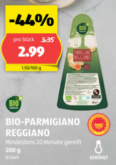 Meiner Meinung nach ist der Preis für den Bio Parmiggiano Reggiano sehr gut. 200g mit 20 Monaten Reifung gibt’s für 2.99 Franken