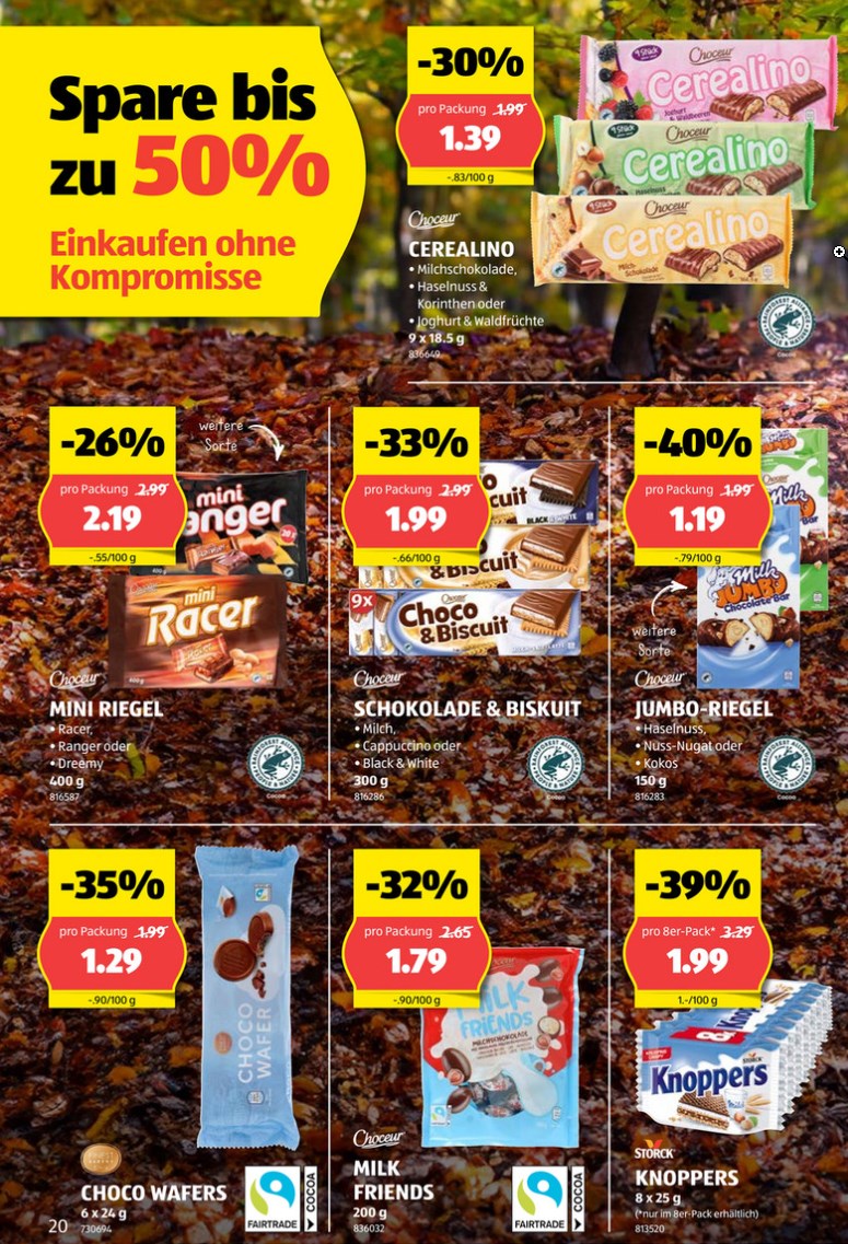Unter anderem finden sich einige Süssigkeiten zu sehr guten Preisen - und damit ideal als Vorbereitung auf Halloween. Die ALDI-Kopien von Balisto, Bueno und Schokobons gibt’s so zum Bruchpreis vom Original: