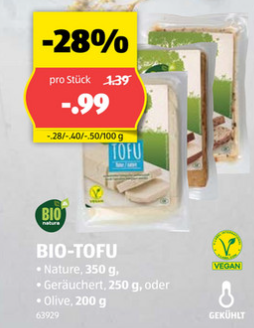 Zum Beispiel findet ihr 350g Bio-Tofu zum Toppreis für 99 Rappen! Als Vergleich: Bei LIDL kosten 500g Bio-Tofu aktuell 1.99 Franken (gestern gekauft). Ihr erhaltet bei ALDI also 40% mehr für den gleichen Preis. Zur Auswahl steht z.B. auch geräuchterter Tofu (allerdings mit weniger „Material“)