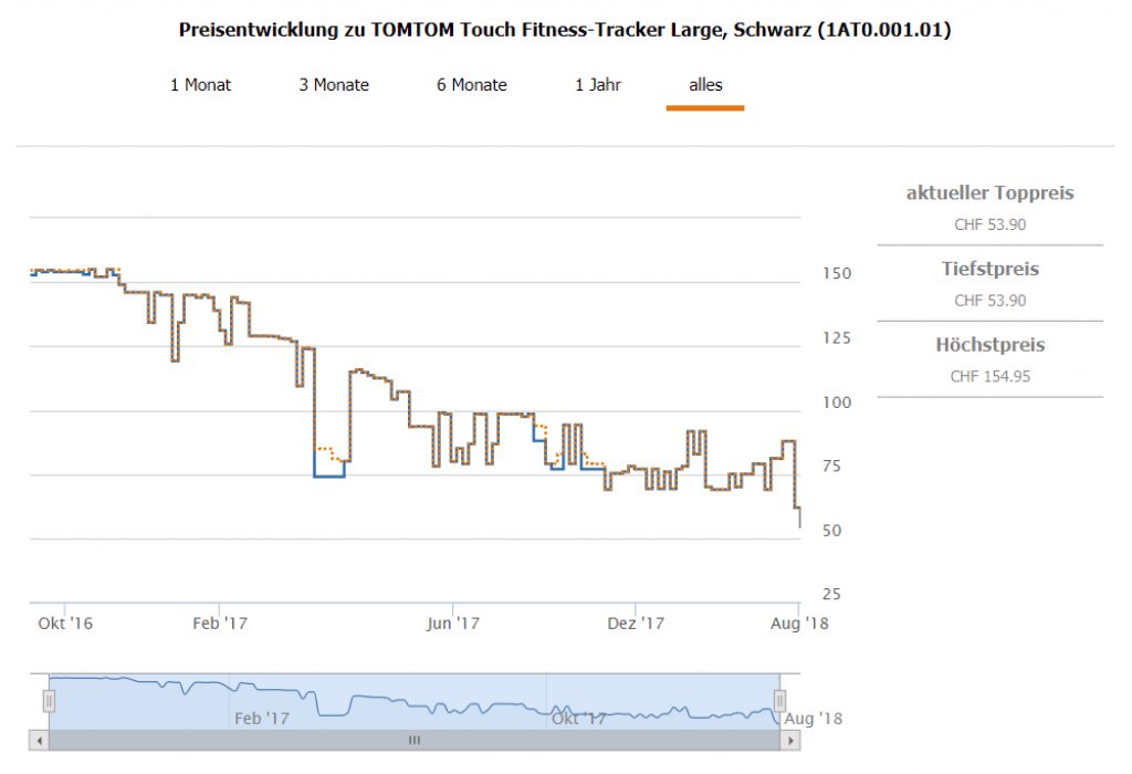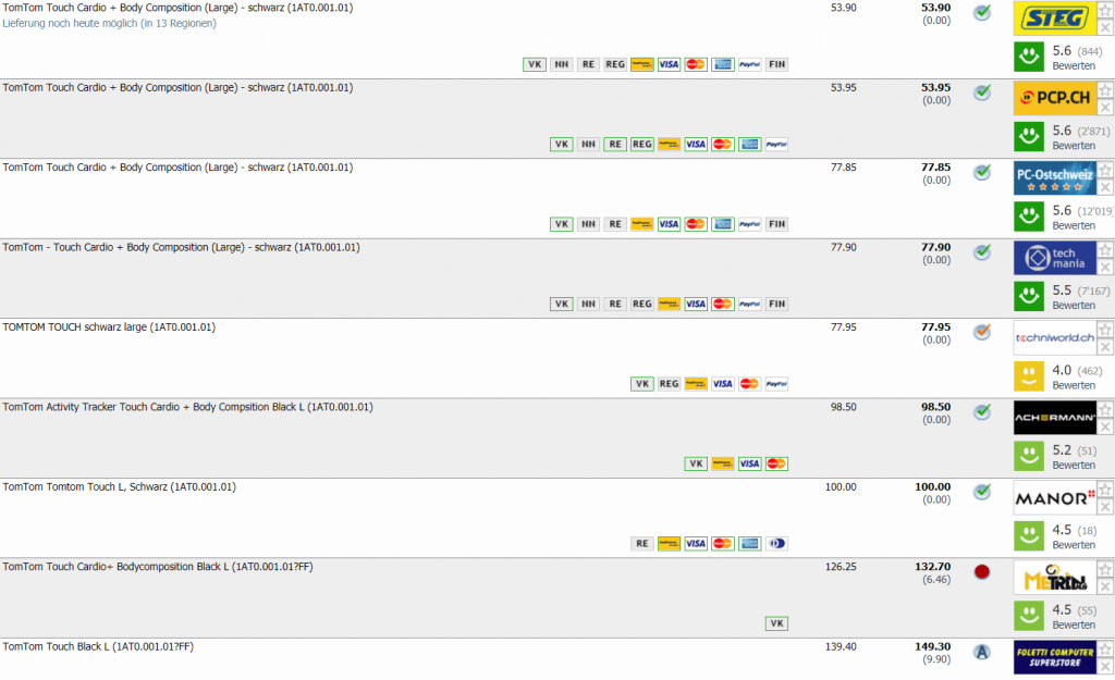Bei Steg PC gibt’s gerade den TomTom Touch Fitness-Tracker mit Herzfrequenzmessung, 24/7 Aktivitätstracking, Smartphone-Benachrichtigung und weiteren Funktionen für CHF 53.90 Den zweitbesten Preis bietet PC-Ostschweiz mit CHF 77.85. Günstiger als für CHF 61.90 gab’s den TomTom Touch Fitness-Tracker in der Schweiz bisher noch nie.