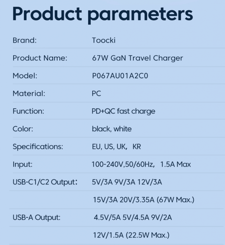 Habe auch ein Toocki in schwarz auch mit 67W. Meines funktioniert tadellos... Lädt ein HP Elitebook unter Vollast oder zwei Handys mit Quickcharge (Xiaomi 11T und Pixel 6) ohne Mühe.