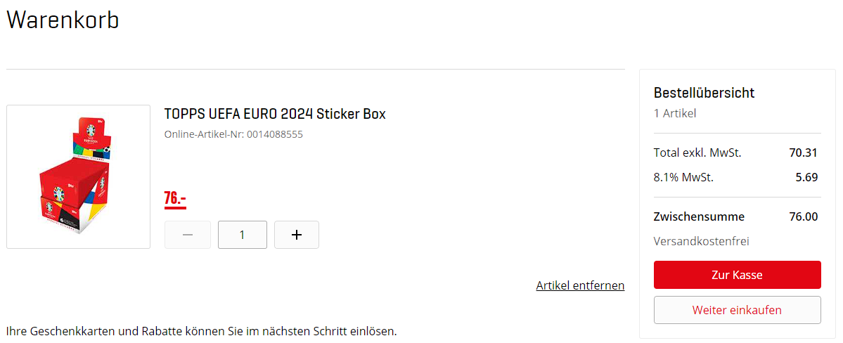 Bei Interdiscount gibt es aktuell die TOPPS UEFA EURO 2024 Sticker Box zum Aktionspreis von CHF 76.- zu kaufen.