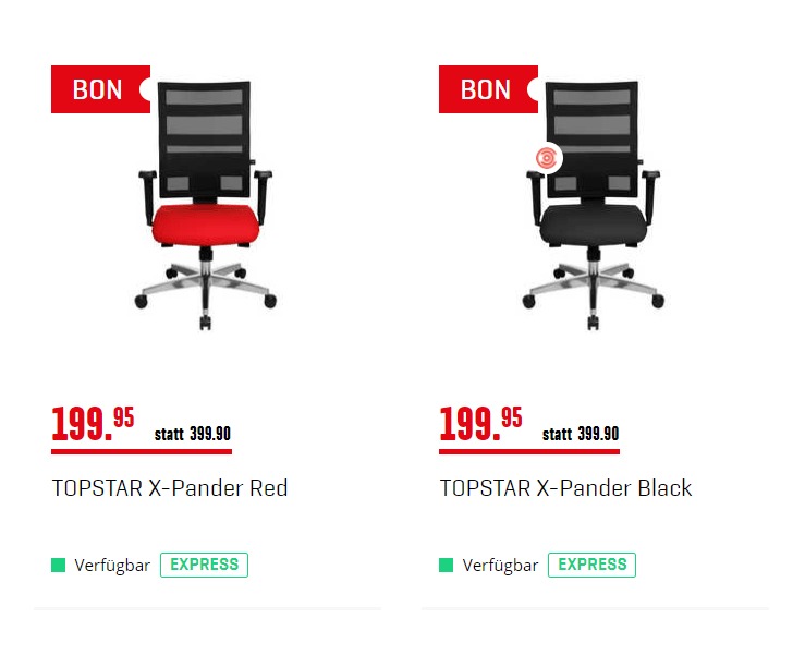 Bei Interdiscount gibt’s den TOPSTAR X-Pander Bürostuhl in schwarz und rot für CHF 199.95 Toppreise hat den Bürostuhl leider nicht erfasst, laut Google Shopping sehe ich den Stuhl sonst nirgends unter CHF 299.- Es ist aber möglich, dass es den Stuhl schon einmal günstiger gab.