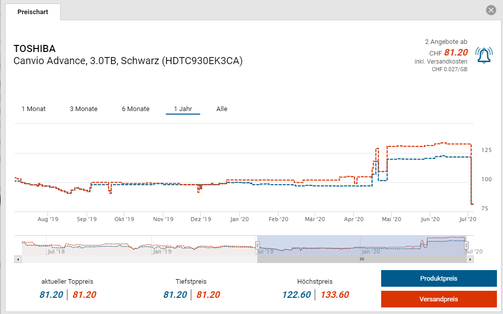 Bei Galaxus und dem Partner Digitec gibt es die TOSHIBA Canvio Advance, 3.0TB Festplatte für den neuen Bestpreis von CHF 81.20. Der vorherige Bestpreis war CHF 97.40. Ein zweitbestes Angebot gibt es leider nicht.