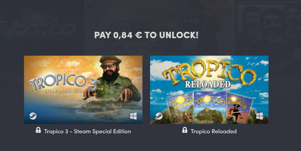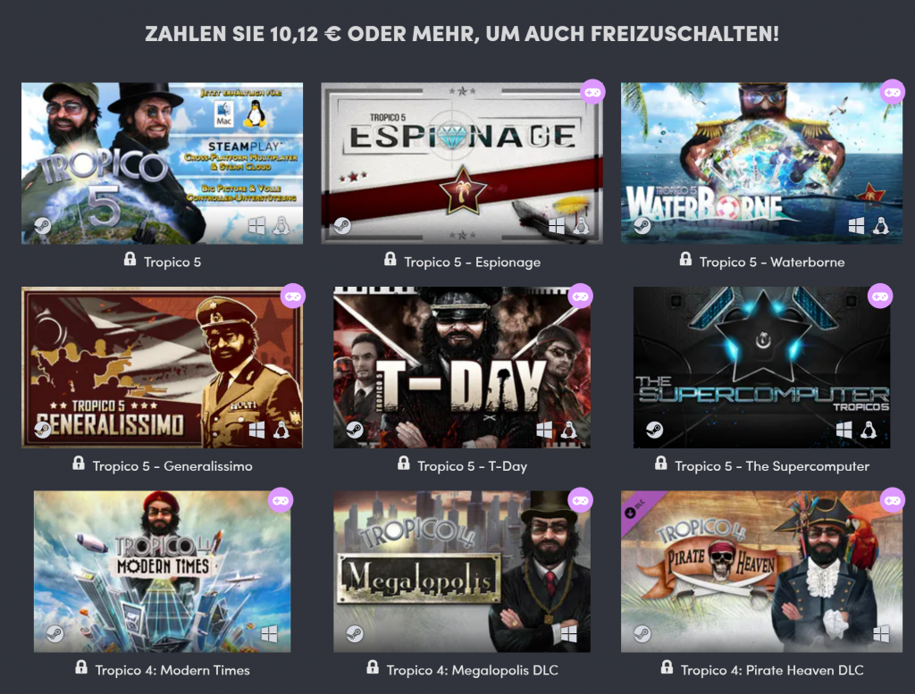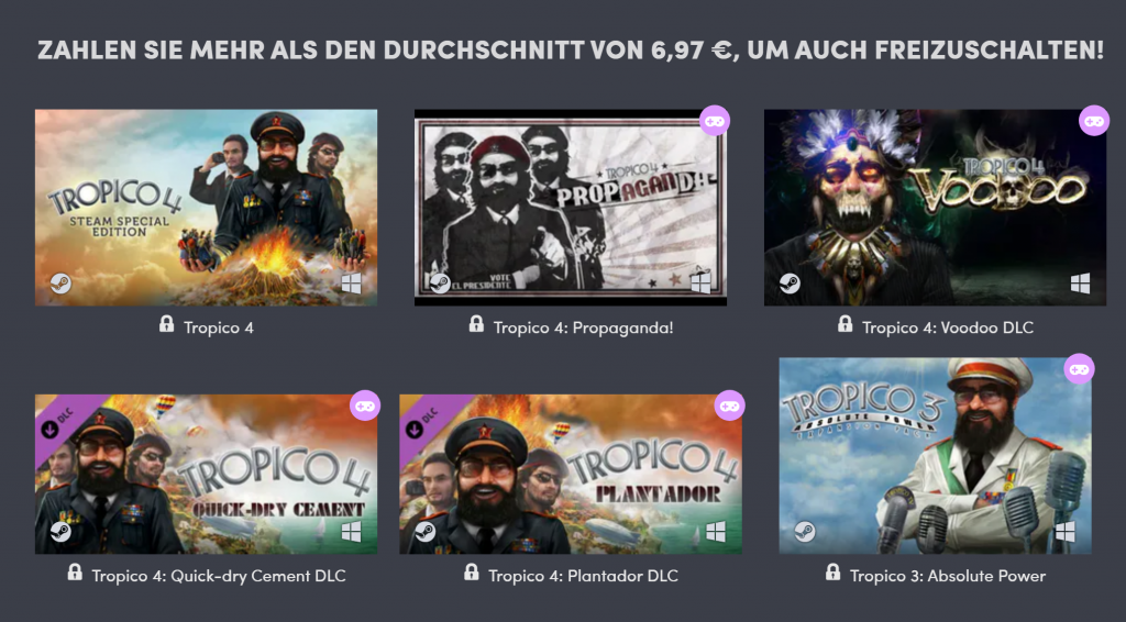 Tier 1 kostet gerade einmal ca. einen Franken und enthält Tropico 3. Tier 2 enthält Tropico 4 inkl. vielen Erweiterungen. Tier 3 Tropico 5 mit vielen Erweiterungen. Leider ist Tropico 6 (das seit über einem Jahr draussen ist, nicht Teil des Humble Bundle)