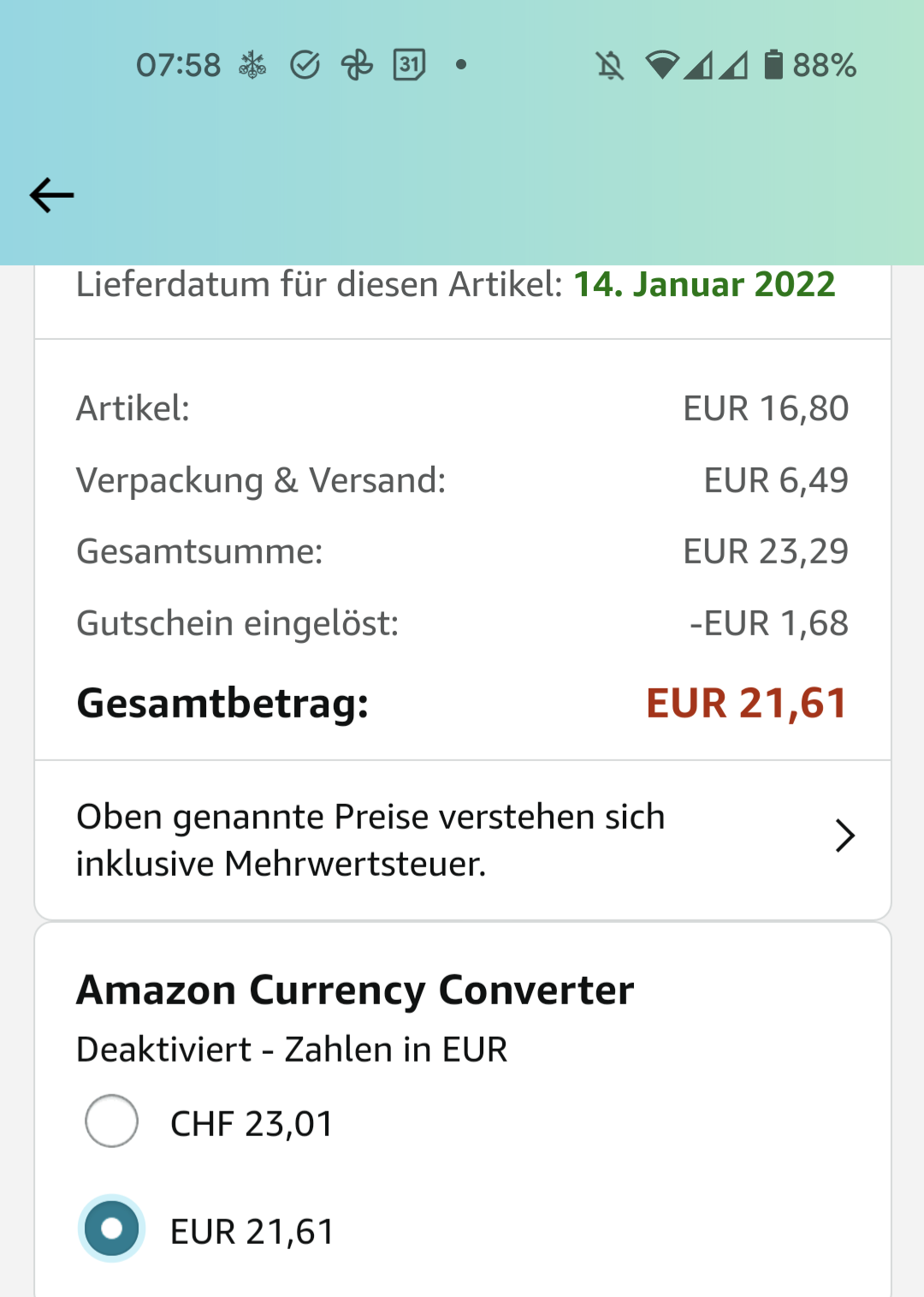 - Für Lieferungen in die Schweiz wird der Preis erst bei Angabe einer Schweizer Lieferadresse richtig angezeigt (Abzug der Mehrwertsteuer, zuzüglich Versandkosten) resp. beim Checkout an der Kasse (Amazon Frankreich, Italien, Spanien und Grossbritannien). Wir verwenden grundsätzlich den Interbanken-Kurs für die Umrechnung in CHF.