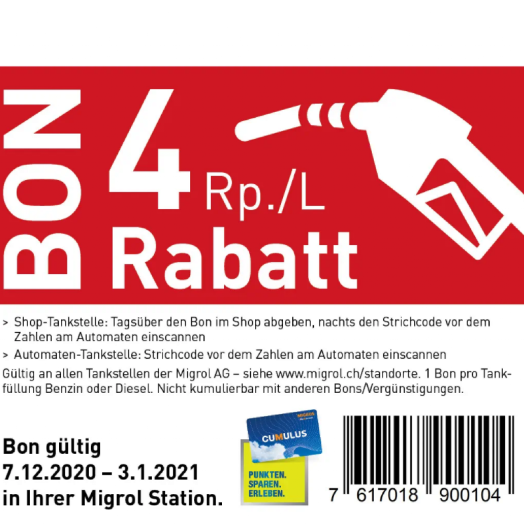4 Rp./L Rabatt beim Benzin- oder Dieselbezug an allen Shop-Tankstellen und Automaten-Tankstellen der Migrol AG (siehe www.migrol.ch/standorte) bis am 3.1.2021.