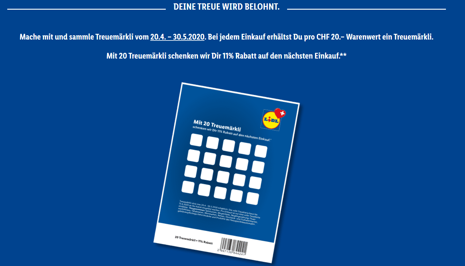 Bei Lidl könnt ihr euch derzeit mit Einkäufen vom 20.4.-30.5.20 11% Rabatt „erarbeiten“. Ihr müsst dazu lediglich die Treuemärkli, insgesamt 20 Stück, zusammensammeln. Um sich für mind. ein Märkli zu qualifizieren, muss man für mind. 20 Franken einkaufen.