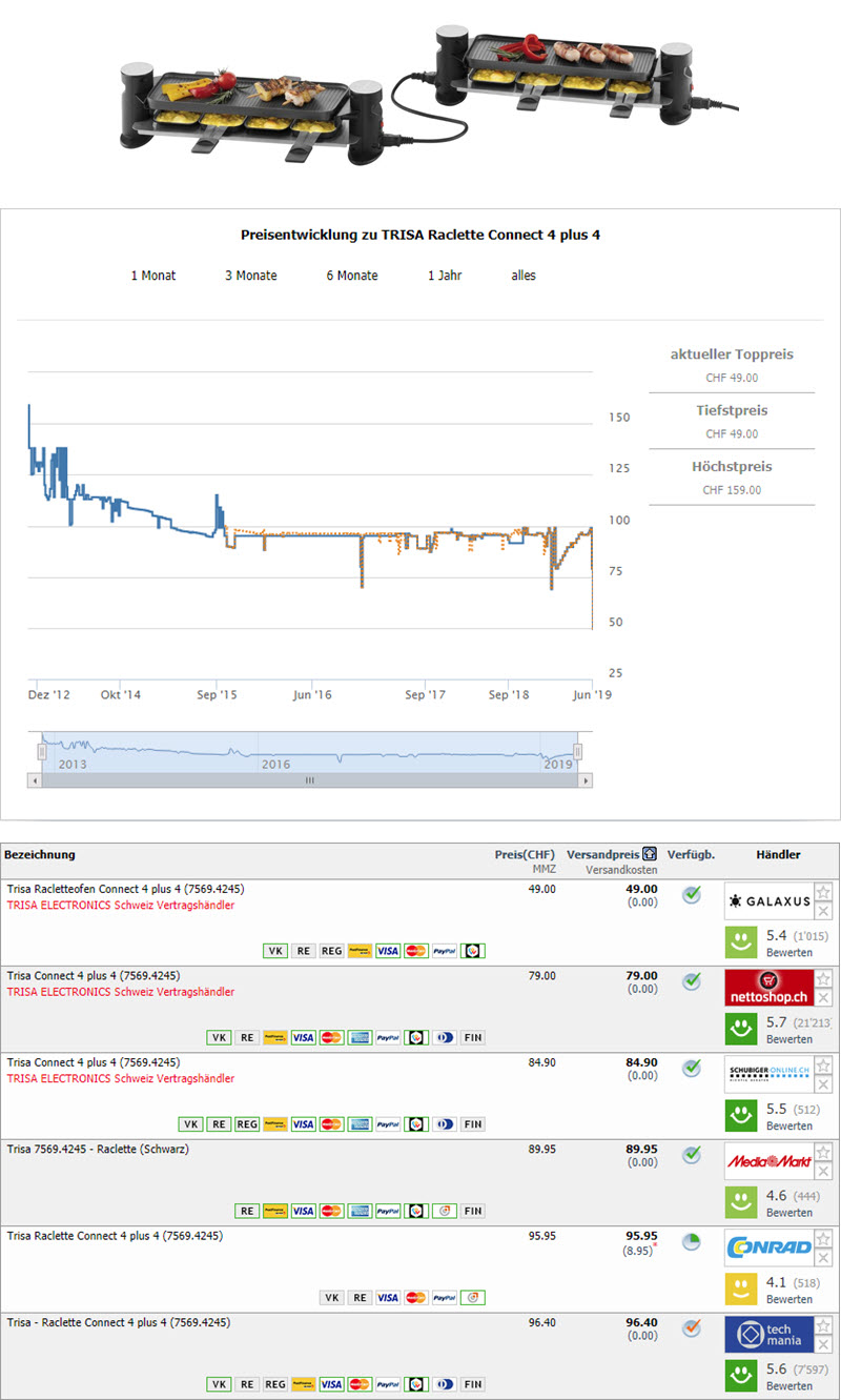 Bei Galaxus gibt es aktuell den Trisa Connect 4 plus 4 Racletteofen zum Bestpreis von CHF 49.-.