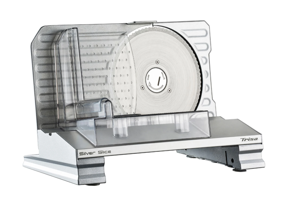 Der Trisa Allesschneider Silver Slice Schneidemaschinen ist aus Aluminiumguss mit einem leistungsstarken 150 W Induktionsmotor hergestellt und bietet perfekte Ergebnisse. Der hochwertige Edelstahl Wellenschliffmesser hat einen Durchmesser von 19 cm, wodurch schnelleres Entfernen des Schlittens für eine einfache Reinigung möglich ist. Die Schnittbreite kann zudem von 1 bis 20 mm variabel angepasst werden. Zudem garantiert der extrem saugstarke Gummifüsse beim Zubereiten immer den nötigen Halt. Optional erhältlich ist die Glattschliffklinge für hauchdünne Scheiben.