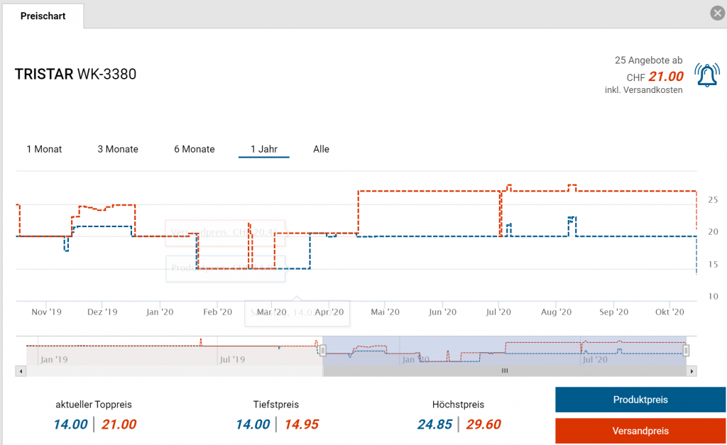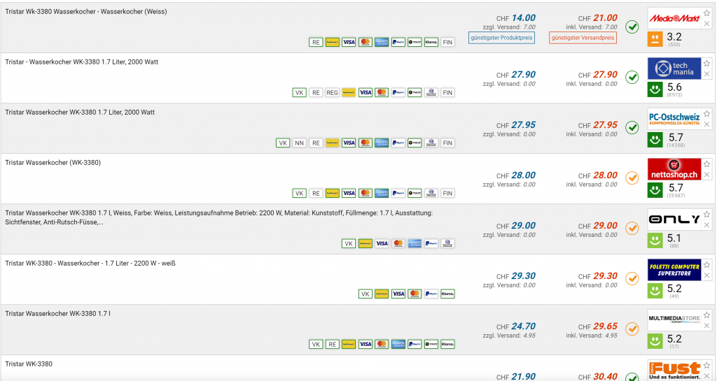 Bei MediaMarkt gibt’s gerade den TRISTAR WK-3380 Wasserkocher mit 1.7l Fassungsvermögen für CHF 14.- wenn er abgeholt wird. Ansonsten werden CHF 7.- für den Versand fällig. Der Trick, noch etwas zusätzlich zu bestellen, um die Versandkosten zu umgehen, klappt leider nicht.