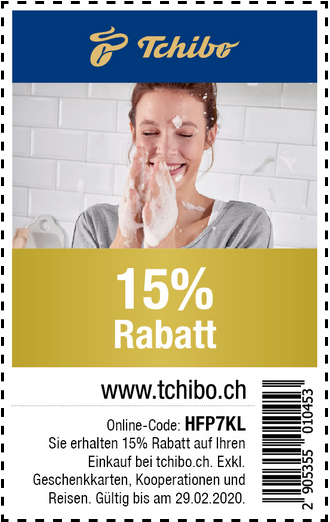 Aktuell gibts bis Ende Februar 2020 auf tchibo.ch. 15% Rabatt auf deinen Einkauf