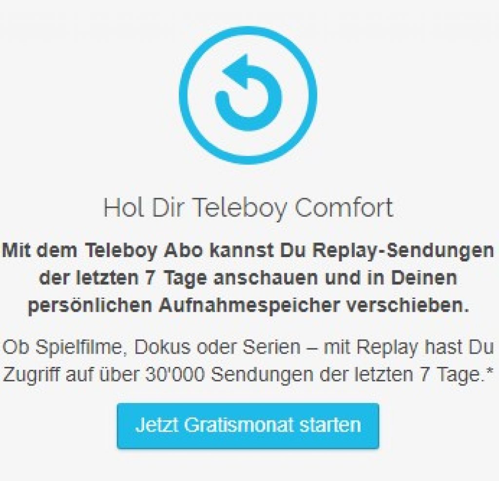 Bei Teleboy könnt Ihr - entgegen den FAQ auf der TV Abos-Übersichtsseite - das Abo «Teleboy Comfort» während 1 Monat für CHF 0.- testen. Dazu einfach den Gutscheincode „COMFORTEST“ einlösen. Wenn ihr auf den Deal-Link klickt ist das Feld auf der entsprechenden Seite damit bereits vorausgefüllt.