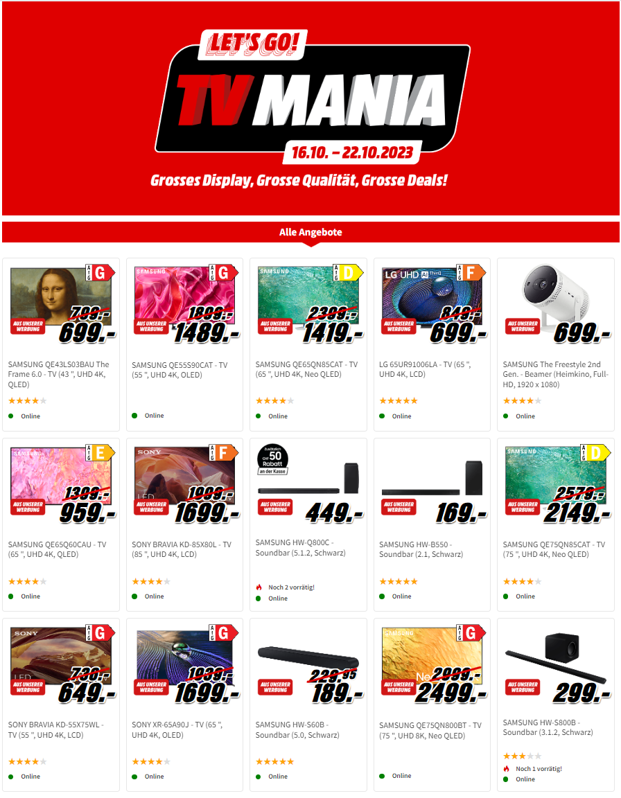 Bei MediaMarkt startet bereits die nächste grosse Aktion! Bei TV Mania gibt es aktuell eine Vielzahl an Home Entertainment Geräten zu Tiefstpreisen. Insgesamt konnten wir 32 Fernseher ausfindig machen, wo der tiefste Preis auf dem Markt angeboten wird - bei vielen sogar mit neuen Bestpreisen!