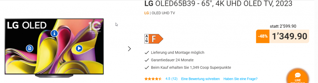 Beispielsweise den LG OLED65B39 - 65″, 4K UHD OLED TV, 2023 für 1349.90 statt 2599.90.