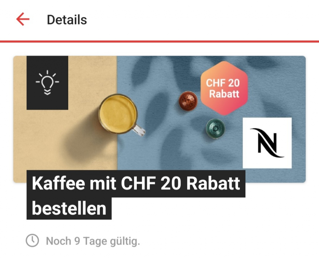 Bestelle deinen liebsten Nespresso Kaffee direkt in der TWINT App und profitiere von CHF 20 Rabatt vom 22. August bis 11. September 2022.