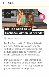 Mit vier Stempeln vom 4. -17. April erhält man in der Twint App 6.90 CHF Cashback auf TooGoodToGo Einkäufe.