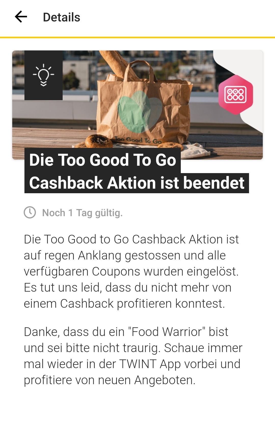 Ich habe gestern mein 4. Mal abgeholt und erst danach gesehen, dass die Cashback Aktion beendet wurde. Schon unverschämt. Man hätte ja wenigstens eine Push Nachricht schicken können.