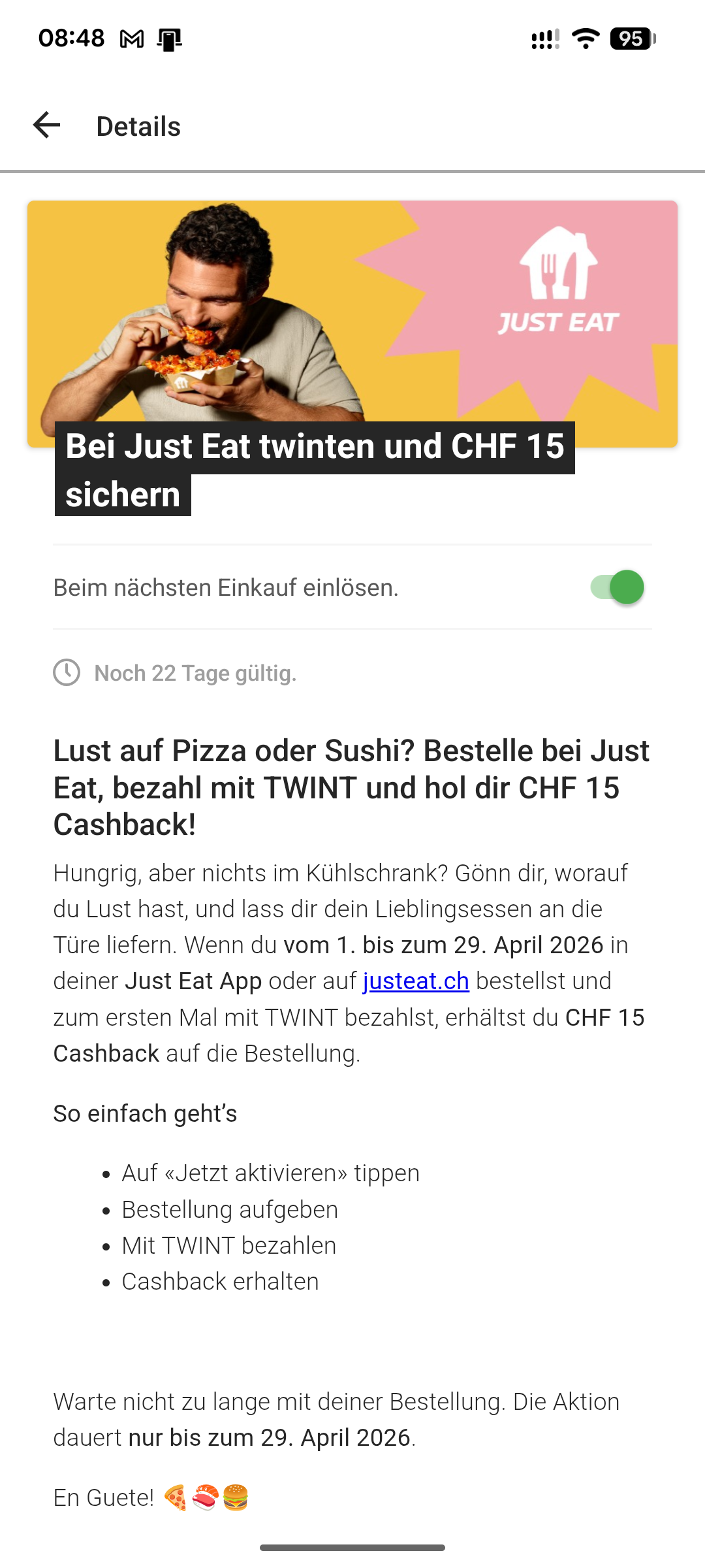 Bei Twint gibt es bis zum 29.04. einen Gutschein für eine Cashback bei Just Eat.