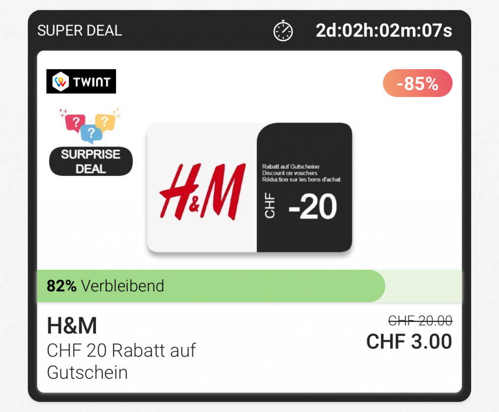 aktuell gibt es bei Twint Super Deals einen H&M Gutschein im Wert von 20 CHF für nur 3 CHF. Dieser kann im Twint Digital Goods Shop eingelöst werden auf einem H&M Gutschein mit mind. Wert 100 CHF. Ihr spart also 17 CHF oder 17%.