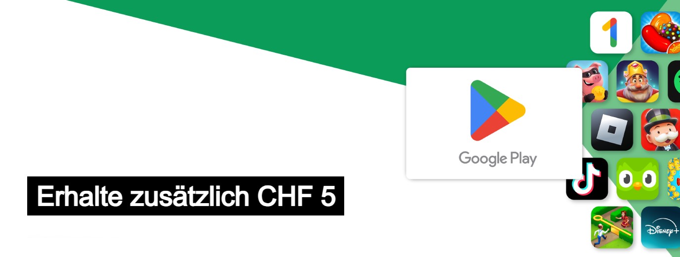 Angebotsbedingungen: Gültig für ein Guthaben im Wert von CHF 5, das beim Kauf einer App, eines Spiels oder eines In-App-Artikels mit einem zum Kaufzeitpunkt gültigen Preis von mehr als CHF 5 bei Google Play eingelöst werden kann. In-App-Abos und Bücher sind ausgeschlossen. Nur für Nutzer, die bei einem teilnehmenden Händler eine Google Play Geschenkkarte im Wert von mindestens CHF 30 zwischen dem 09.09.2024 und dem 15.09.2024 erwerben. Die Google Play Geschenkkarte muss bis zum 22.09.2024 eingelöst werden. Der Rabatt wird bei Google Play an der Kasse abgezogen. Das Guthaben verfällt 14 Tage nach Einlösung der Geschenkkarte. Das Angebot kann einmal pro Nutzer beansprucht werden. Die kompletten Angebotsbedingungen findest du unter g.co/play/giftcards. Google Play ist eine Marke von Google LLC. ©.