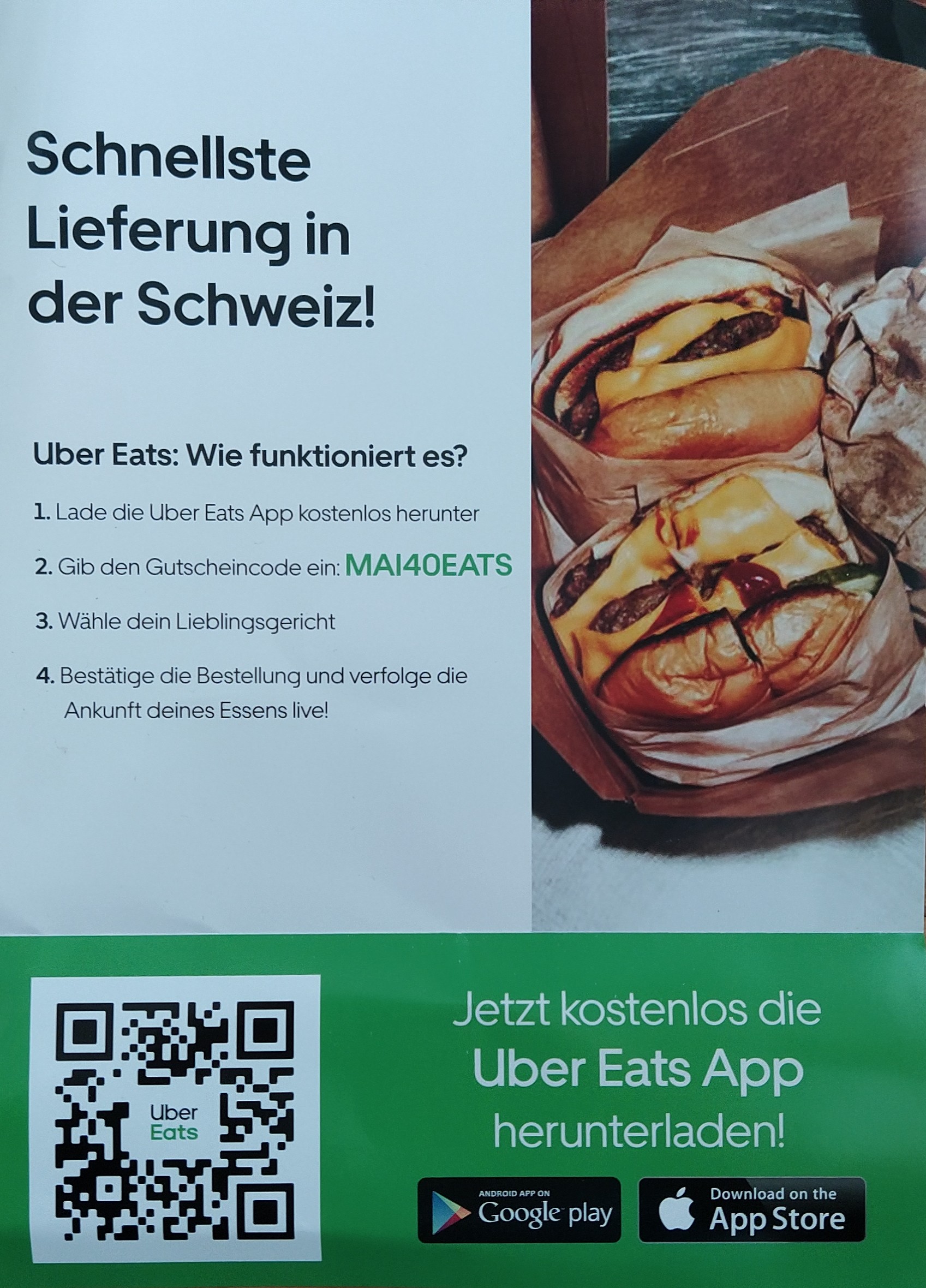 Auf die erste Bestellung gibt es 40.- Rabatt. Das Angebot ist gültig bis zum 06.06.2021 auf die erste Bestellung auf Uber Eats.
