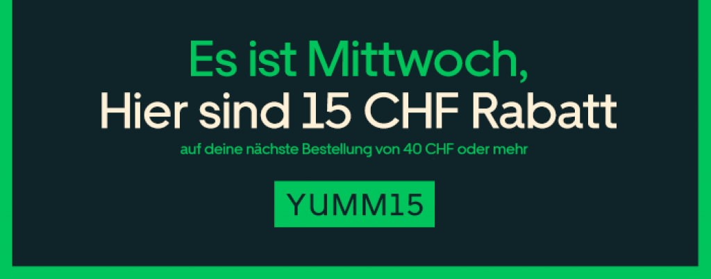 Bei Uber Eats erhält man mit dem Code YUMM15 noch bis zum 20. Oktober 2020 einen Rabatt von CHF 15.- ab CHF 40.-