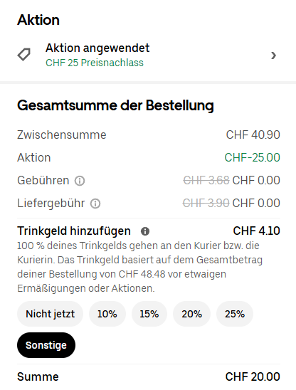 Heute per e-Mail erhalten. 25.- Rabatt für die ersten zwei Bestellungen bei Uber Eats (ab 40.-) exkl. Alkohol.