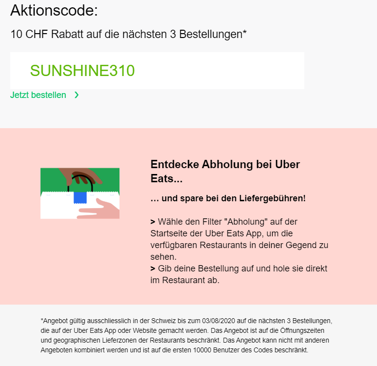 Bei UberEats gibts derzeit eine Aktion wo man bei 3 Bestellungen 10 Franken Rabatt erhält, die Aktion gilt aber nur noch bis zum 3.8.