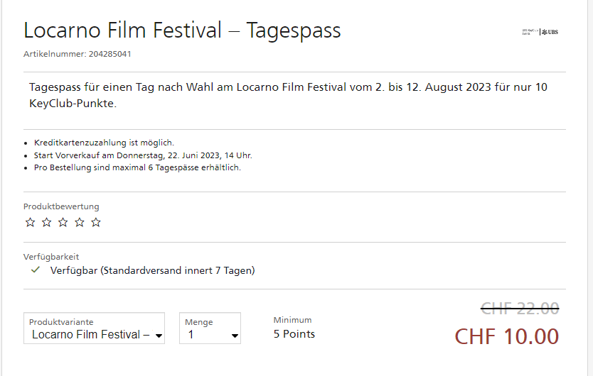 (nur für UBS-Kunden) Tagespass für einen Tag nach Wahl am Locarno Film Festival vom 2. bis 12. August 2023 für nur 10 KeyClub-Punkte. Pro Bestellung sind maximal 6 Tagespässe erhältlich.