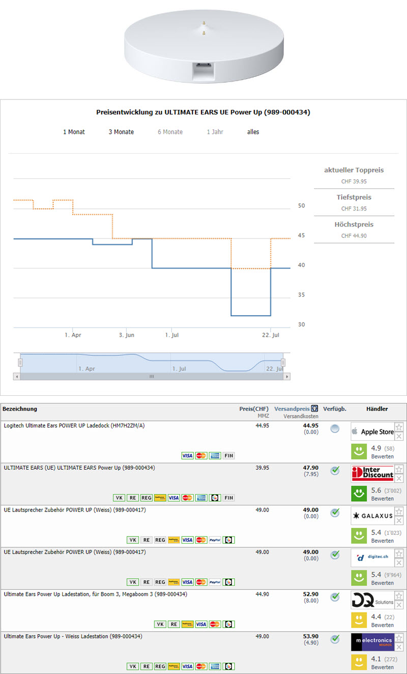 Bei Digitec gibt es im Tagesdeal die UE Boom 3 im Bundle mit dem Power Up in den Farben Blau, Rot oder Schwarz zum Bestpreis von CHF 119.-. Rechnet man aktuell die günstigsten Einzelpreise für eine UE Boom 3 und Power Up zusammen, so kommt man auf rund CHF 160.-.