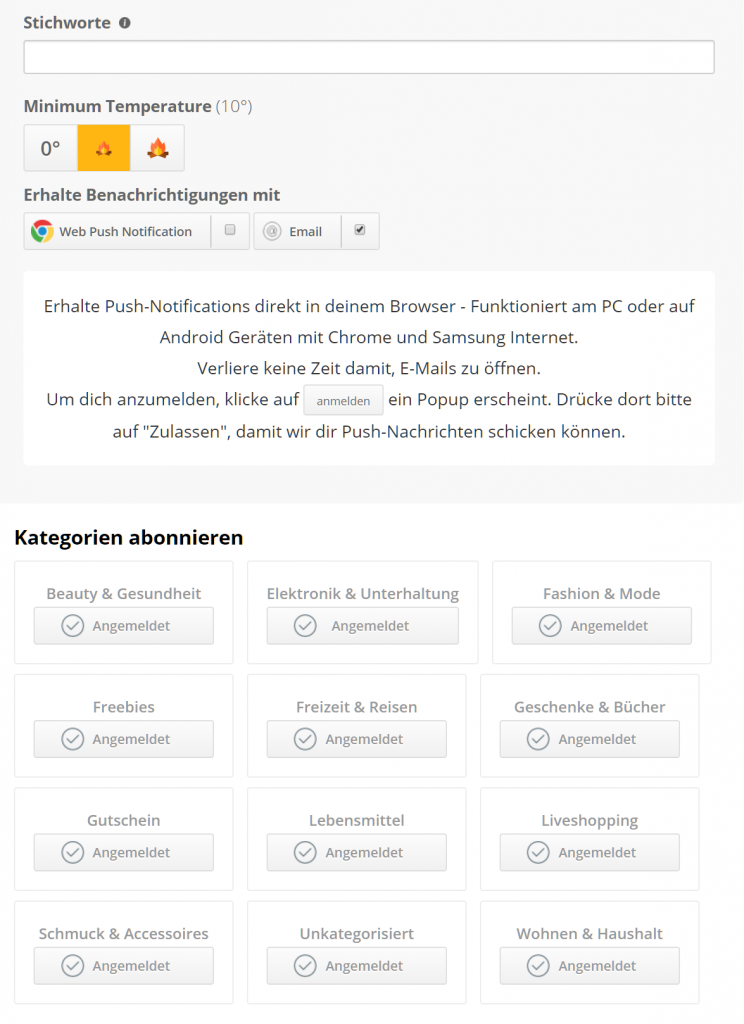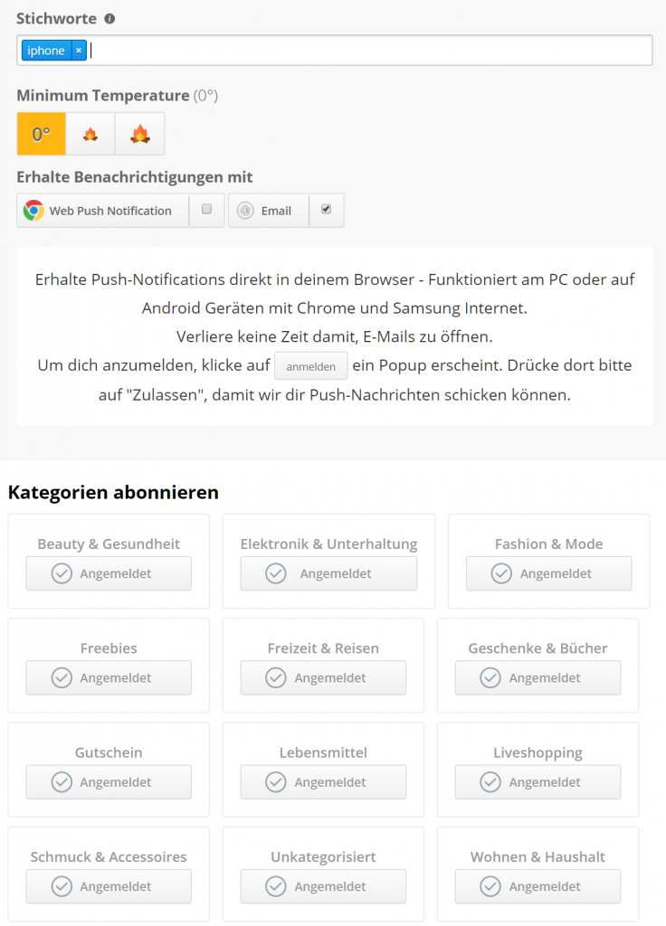 Ich möchte ein Mail/Push erhalten, sobald ein sehr guter Deal da ist (mind. 10 Likes)