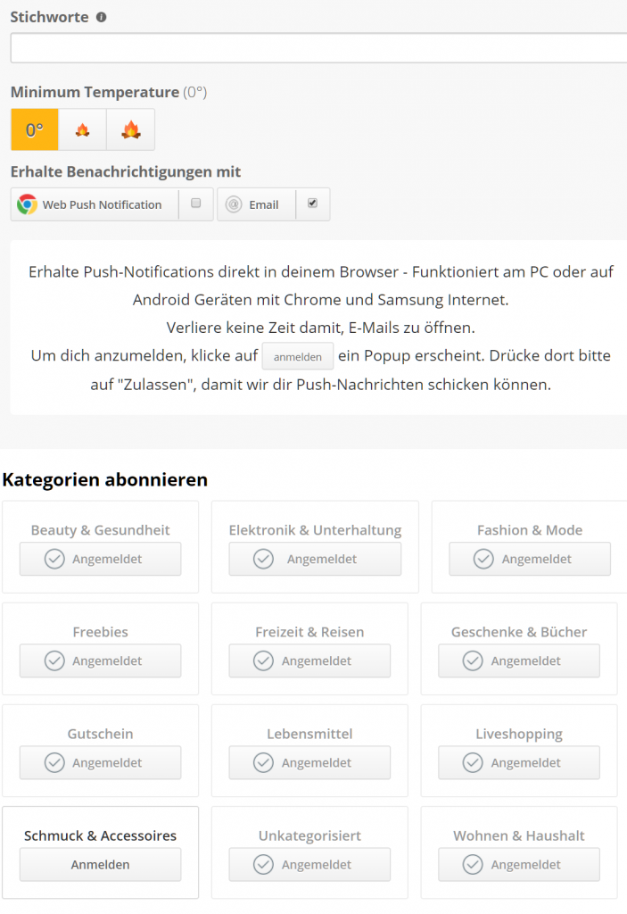 Ich möchte ein Mail für jeden neuen Deal erhalten (ausser für die Kategorie Schmuck & Accessoires)