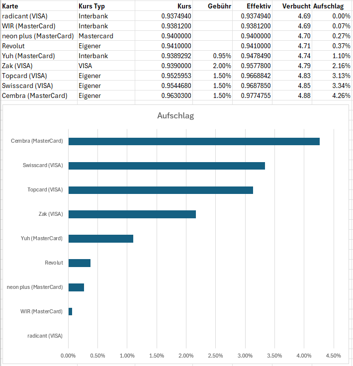 - ❌ Nicht auslandtauglich für Kartenzahlungen: Eigener Wechselkurs (prinzipiell schlechter als der Interbankenkurs) + 1.7 – 3.6% Wechselkursaufschlag