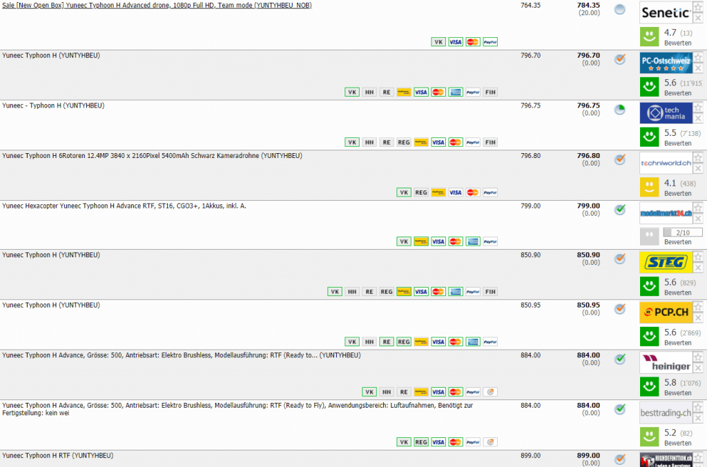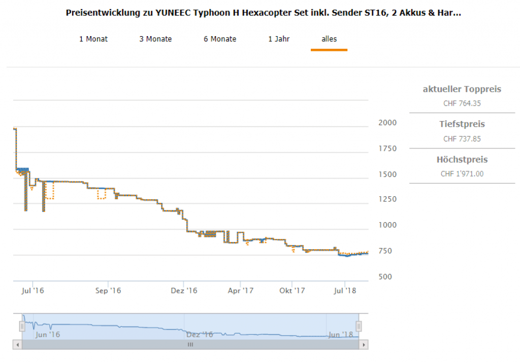 Bei digitec gibt’s gerade die Kameradrohne Yuneec Typhoon H Advance mit UHD-Aufnahmefunktion für CHF 599.- Der Bestprice in der Schweiz lag laut toppreise bei CHF 737.- momentan ist der zweitbeste Preis bei CHF 784.35.