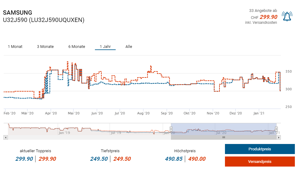 Bei Interdiscount gibts derzeit den Ultra-HD-Monitor U32J590 von Samsung zum Preis von CHF 299.90. Laut toppreise soll der zweitgünstigste Preis bei 349 Franken liegen, der Bestpreis lag zuletzt am Black Friday/Cyber Monday 2019 bei fast 250 Franken.