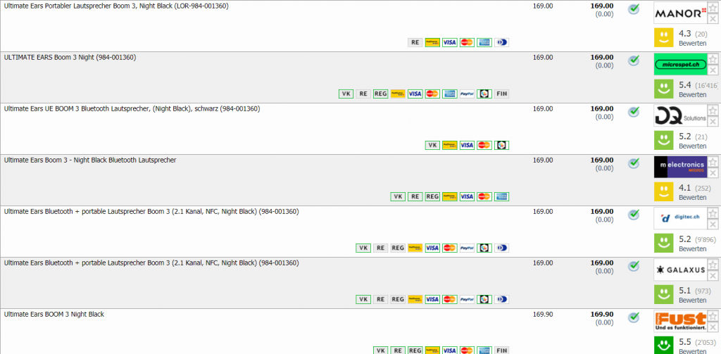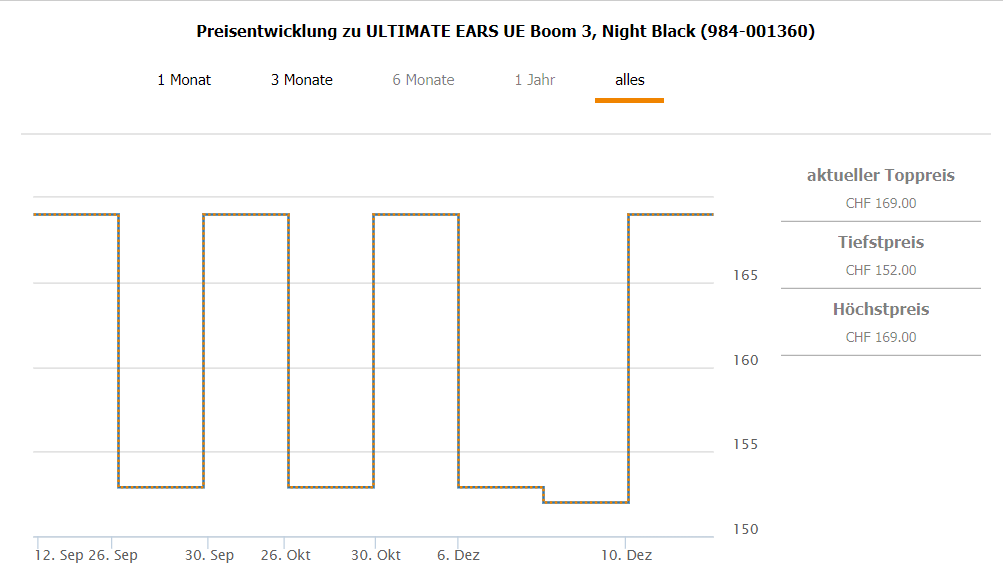 Bei Interdiscount gibt’s gerade die Ultimate Ears Boom 3 für CHF 125.90, wenn man beim Checkout den Gutscheincode HFWID10 einsetzt. Bisheriger Bestpreis war bei CHF 152.- im Moment liegt der zweitbeste Preis bei CHF 169.-