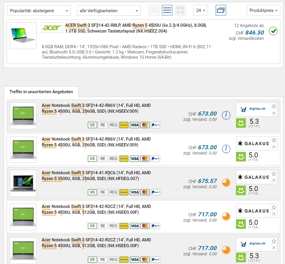 Das Acer Ultrabook das gerade in Aktion ist gibts so in dieser Konfiguration scheinbar nur bei melectronics, es gibt aber auch günstigere Varianten bei digitec, Amazon etc.