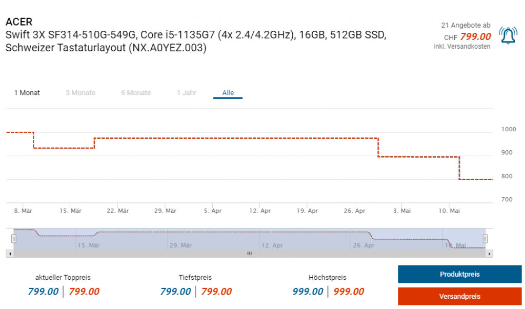 Laut toppreise liegt der Vergleichspreis bei knapp 894 Franken, es handelt sich bei diesem Angebot zudem um einen neuen Bestpreis.