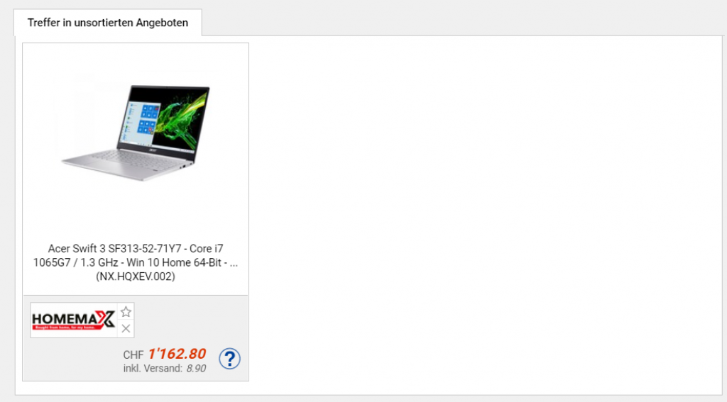 Bei Amazon gibts derzeit das Ultrabook Swift 3 von Acer mit QHD-Display, i7-10 Prozessor und üppiger 1TB SSD zum Aktionspreis von CHF 765.-. Scheinbar gibts genau dieses Modell bei lediglich einem Anbieter für stolze CHF 1162.80.