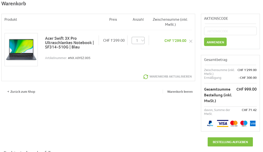 Im Onlineshop von Acer Schweiz bin ich auf ein sehr gutes Notebook im ultraschlanken Design gestossen. Es handelt sich dabei um das Acer Swift 3X Pro. Einige mögen denken „ACER“ mag ich nicht, eher billig oder keine Leistung. Man muss allerdings sagen, dass sich diese Firma sehr gut gemacht hat und inzwischen einige sehr gute Geräte zu guten Preisen im Sortiment hat. Der Preis von CHF 999.-wird automatisch angepasst, sobald man das Gerät im Warenkorb hat.