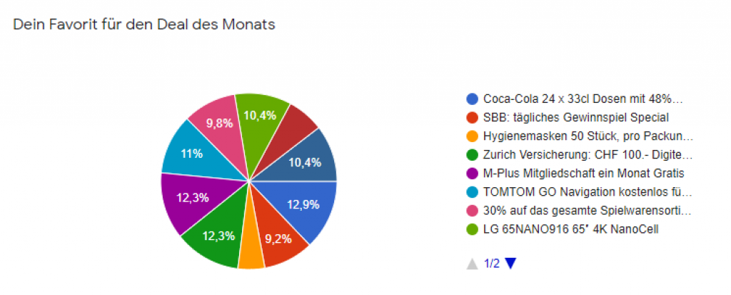 [UPDATE]: Gewonnen hat @yuna mit seinem Deal: „Ab Dienstag bei Denner: Coca-Cola 24 x 33cl Dosen mit 48% Rabatt (Classic&Zero)“. Die Ergebnisse waren relativ nahe beieinander (Yuna hatte 12.9%, die nächsten beiden Deals bereits 12.3%), danke trotzdem an alle die mitgemacht haben und immer wieder tolle Deals einsenden! 🙂 Im Monat November gibt es insgesamt 7 Preise im Wert von CHF 550.- zu gewinnen. Wir bedanken uns nochmals an alle, die auch bei der Umfrage geholfen haben und freuen uns auf einen „angebotsvollgepackten“ November.