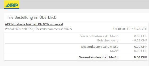 Momentan laufen bei ARP die letzten Sales-Tage. Mit dem Newsletter Gutscheincode (Anmeldeformular auf Website), welcher einen Wert von CHF 10.- hat (1x pro Kunde einlösbar), kann man sich somit aktuell das Universal Notebook Netzteil Kfz 90W inklusive 19 Adapterstecker völlig kostenlos und portofrei bestellen. Weitere Sales-Produkte finden sich hier, bei denen man ebenfalls den Gutscheincode beim Checkout verwenden kann.