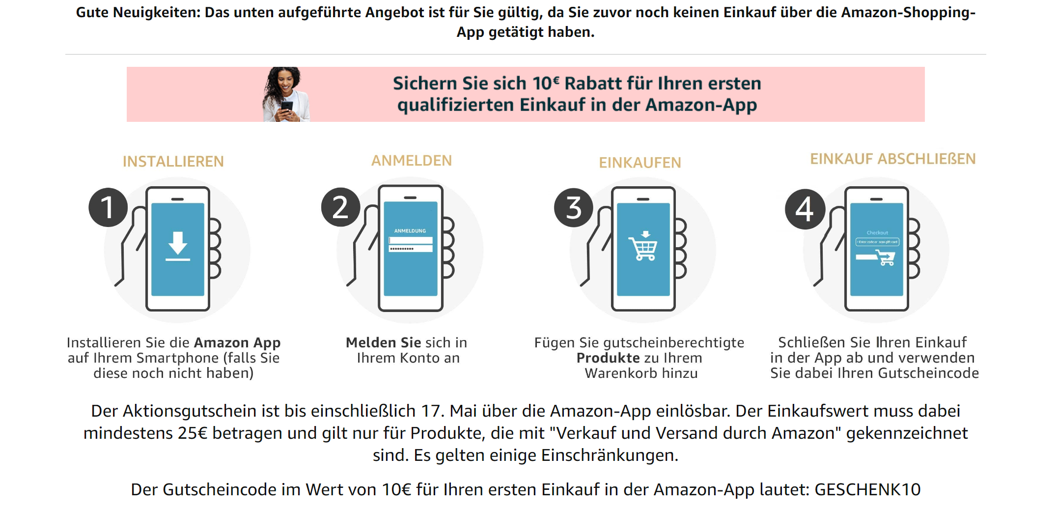 Vollständige Geschäftsbedingungen Vollständige Geschäftsbedingungen Vom 27. April - 17. Mai 2023 können teilnahmeberechtigte Amazonkunden, die zum ersten Mal einen Kauf auf ihrem Mobiltelefon mit der Amazon-Shopping-App (für iPhone oder Android-Smartphones) abschließen, 10€ auf ihren qualifizierten Einkauf, ab einem Wert von 25€, sparen, indem sie einen einmaligen Aktionscode (das „Angebot“) benuzten. Es gelten die Allgemeinen Geschäftsbedingungen, siehe unten für weitere Details.