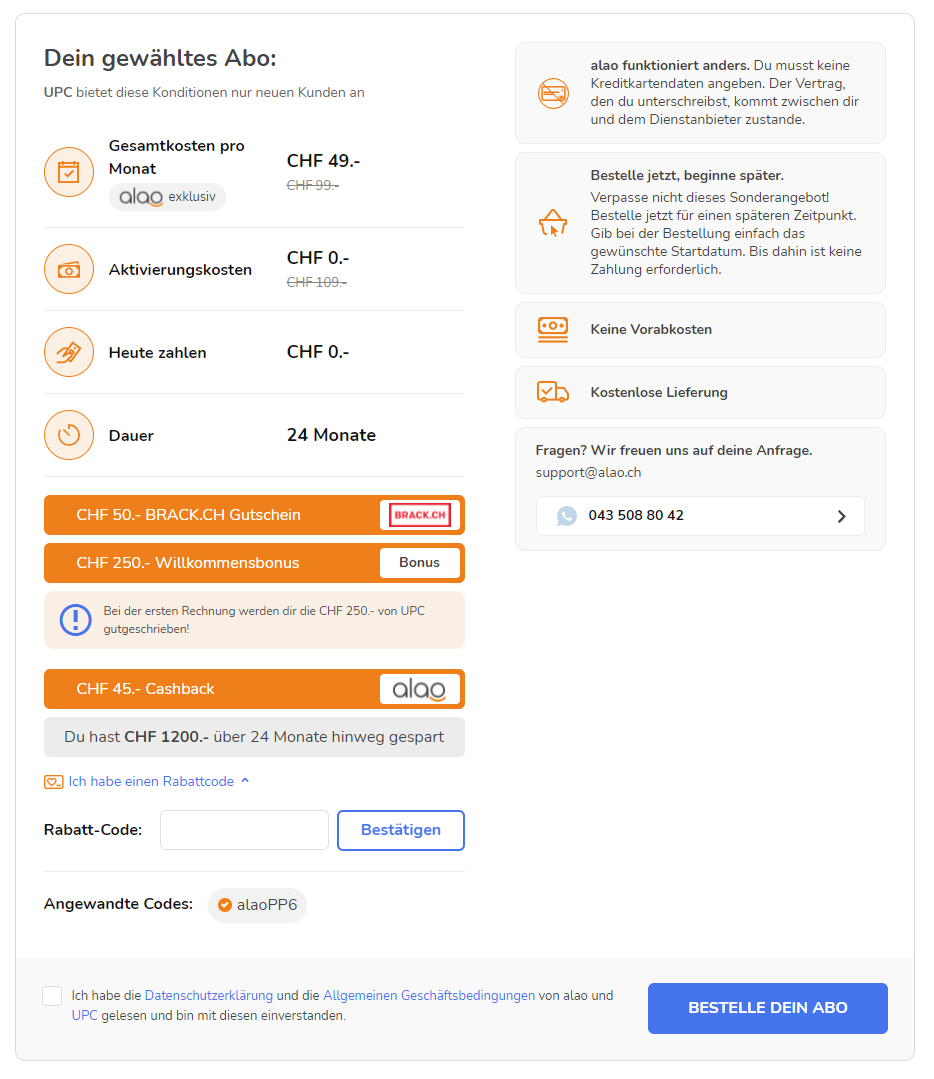 Vor 3 Wochen gab es das UPC Home Abo bereits zu einem tollen Preis – wird nun jedoch komplett überschattet von dem genialen Angebot, welches gerade gilt. Du schliesst das Abo nur über Alao ab, gelten tut dies normal bei UPC. So kriegt man folgendes:
