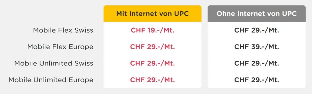 Hier die Fakten zu den anderen Abos. Wie ihr seht - auch ohne Internet von UPC profitiert man von diesem Angebot: