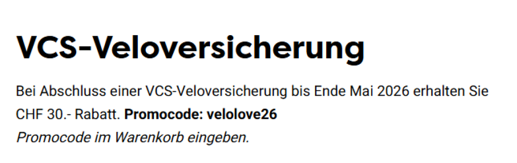 Beim VCS findet ihr aktuell die VCS-Veloversicherung in Aktion mit einem Rabatt von CHF 30.- auf jeden Abschluss mit Promocode velolove26 (bis 31. Mai 2026).