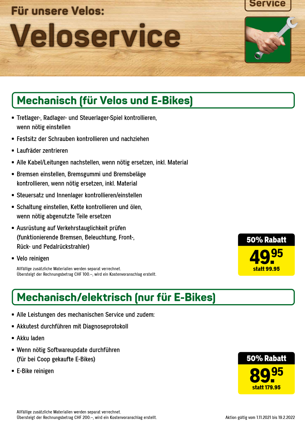 Ihr könnt bis 19. Februar 2022 bei coop Bau&Hobby euer Velo für CHF 49.95 statt 99.95 in den service bringen. Der ebike service hat ebenfalls 50% Rabatt und kostet CHF 89.95.